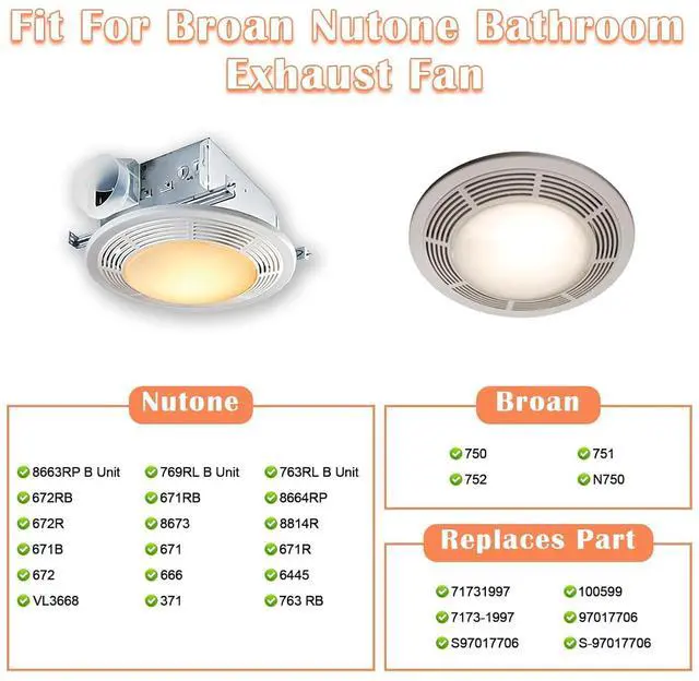 Fit For Broan Nutone Bathroom Exhaust Fan Models - Nutone 8663RP B Unit, 769RL B Unit, 672RB, 763RL B Unit, 671RB, 8664RP, 672R, 8673, 8814R, 671B, 671, 671R, 672, 666, 6445, VL3668, 371, 763 Rb. Broan 750, 751, 752, N750. Replaces Part: 71731997, 100599, 7173-1997, 97017706, S97017706, S-97017706.