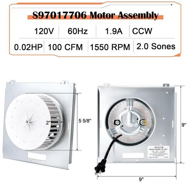 Parameter of Nutone S97017706 - 5 5/8'' Dia x 2'' H Blower Wheel, 9" L x 9" W Mounting Bracket, 3 7/16'' Dia x 2 3/16'' H Motor, 2-Prong Plug, Shaft Rotation: CCW, Voltage: 120V, 1.9A, 60 Hz, 100 CFM, 1550RPM, 0.02HP, Thermally Protected. For Use with Model 8663RP "A" Housing Only.