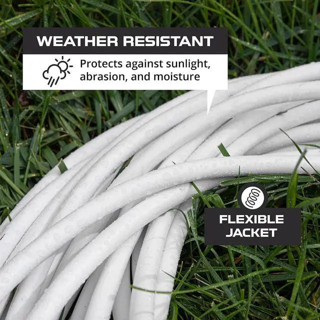 MULTIPURPOSE WHITE EXTENSION CORD: With SJTW rated for weatherproof, this 50ft white electrical cord with multi outlets is perfect for indoor or outdoor use. It is an ideal extension cord for landscaping, lawn and garden tools, power tools, TV, game console, computer/laptop, lamp, indoor & outdoor lights decoration and much more.