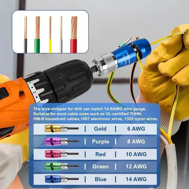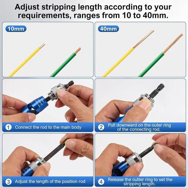 Drill-Powered Stripping: Stop stripping wires by hand! This drill wire stripper tool cleanly strips 6-14 AWG wires in one secondwithout damaging conductors. Adjust stripping depth10-40mm (0.4-1.5 inches), reduce fatigue, and speed through high-volume jobs safely.