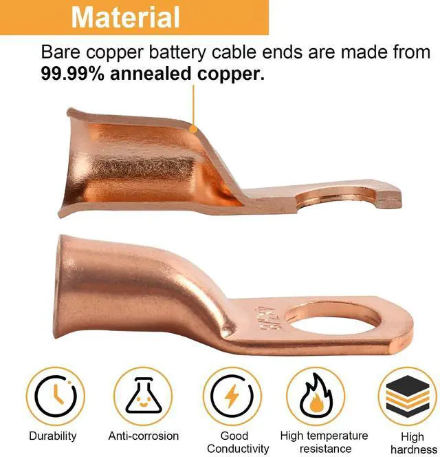 High Quality: Bare copper battery cable ends are made from 99.99% annealed copper,with a heavy duty construction for high temperature durability designed, special treatment surface for corrosion protection,good weldability. And enhanced mechanical strength can be crimped or soldered.