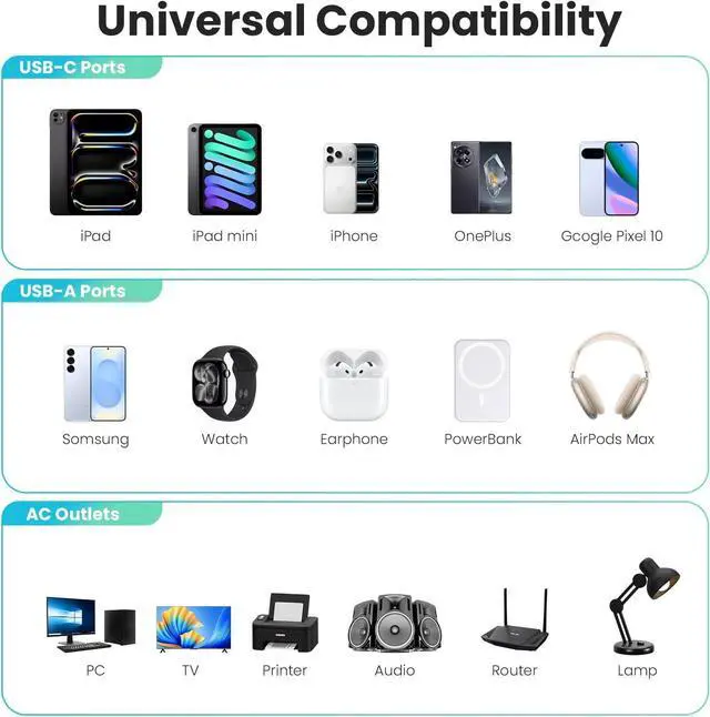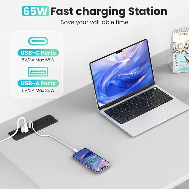 65W PD Fast Charging: USB-C ports deliver up to 65W, while USB-A ports provide up to 36W. Compatible with PD/QC protocols for rapid charging of laptops, tablets, and other high-power devices.