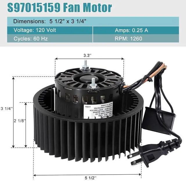 Parameter of Broan S97015159 - 120 Volt, 60Hz, 0.25 Amps, 2.2uf/250V Capacitor, 1260 RPM, Rotation = CCW, Ball Bearing. 3.3'' Dia x 2 3/16'' H Motor, 5 1/2'' Dia x 2 3/16'' H Blower Wheel. Package: This broan 97015159 blower assembly includes a fan motor and blower wheel, ensuring a seamless replacement for select models.