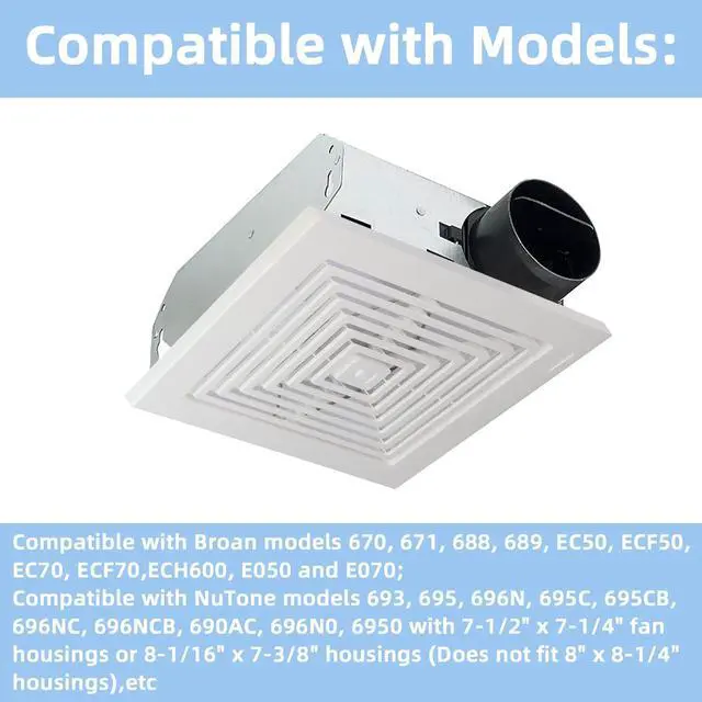 Compatible with NuTone Models: The BKR60 motor assembly for NuTone 693, 695, 696N, 695C, 695CB, 696NC, 696NCB, 690AC, 696N0, 6950 with 7-1/2" x 7-1/4" fan housings, 8" x 7-1/4" fan housings, and 8-1/16" x 7-3/8" fan housings.