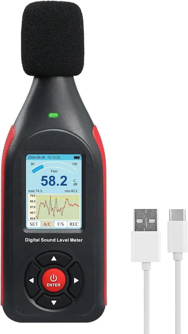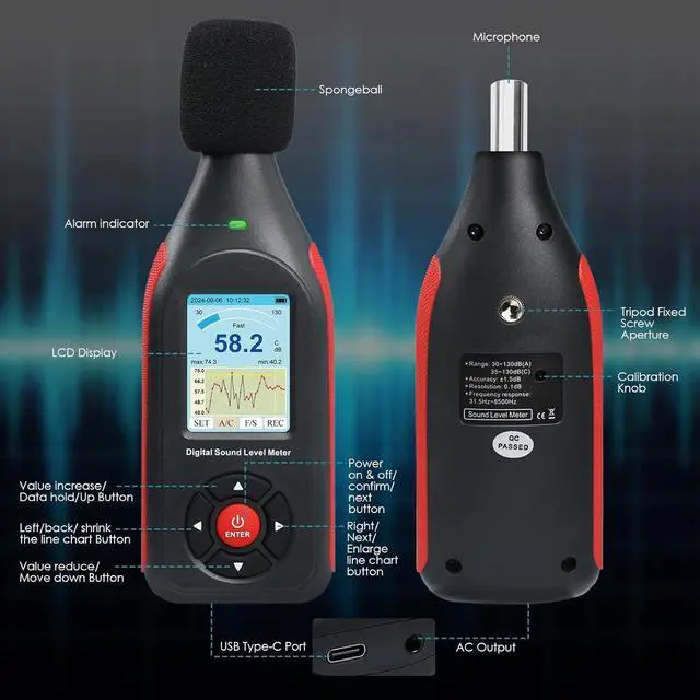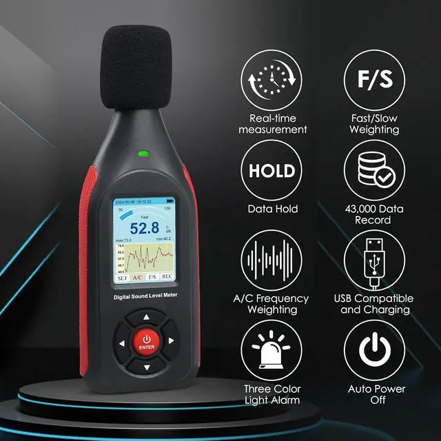 LCD DisplaySound decibel meter is equipped with a large backlit colour LCD display which shows the date and time clearly and graphically, making it easy to read. Sound decibel meter has a measurement range of 30~130dB