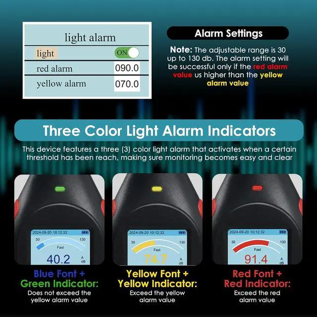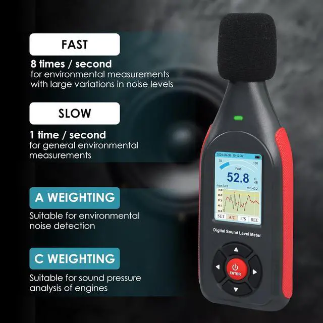 Dual Weighting ModesThe decibel meter with alarm switches between A and C frequencies. sound meter offers versatility for different sound environments. Measurement response is simultaneously fast and slow adjustable, and is equipped with a DC output