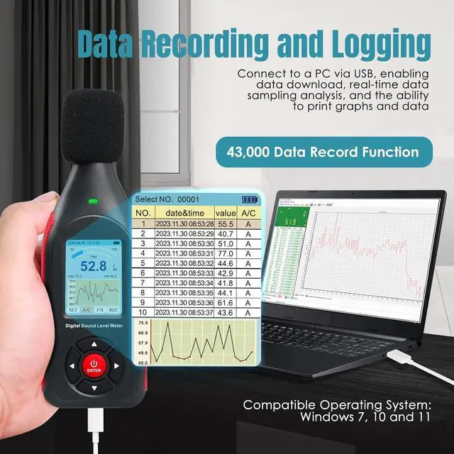 PC ConnectionSound level meter can record up to 43,000 data, which can be viewed on both the host computer and PC, as well as connected, data exported, analysed and printed. Sound meter can be recharged by USB
