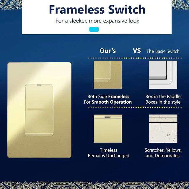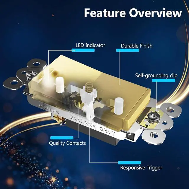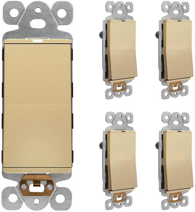 5-Pack, Gold Color; Device Dimensions 1.4" Weight x 2.75" Height x 1.0" Depth; 15A, 120-277 VAC, Pole Only; Broken Drywall Ears; Ground Screw; Wiring Instructions Included; Wall Plate Sold Separately; 1-Year Warranty; UL Listed