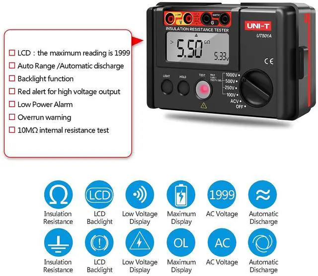 Energy Saving And Power Saving: Megohmmeter tester Low battery warning display, the instrument will automatically shut down after 10 minutes without operation, long battery life, and there will be a red warning light when high-voltage output to ensure safety and efficiency