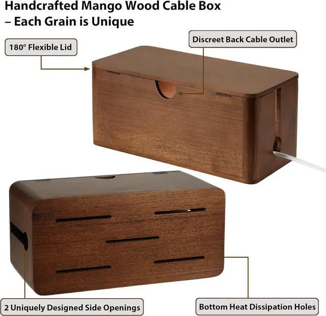 Premium Natural Mango Wood: This cable box is made from 100% natural, sustainably sourced mango wood. Each piece features a unique, naturally grown grain pattern, with natural variations in color and texture, adding a warm, natural wood aesthetic to your home or office