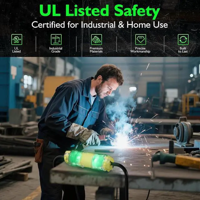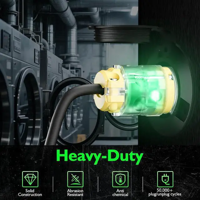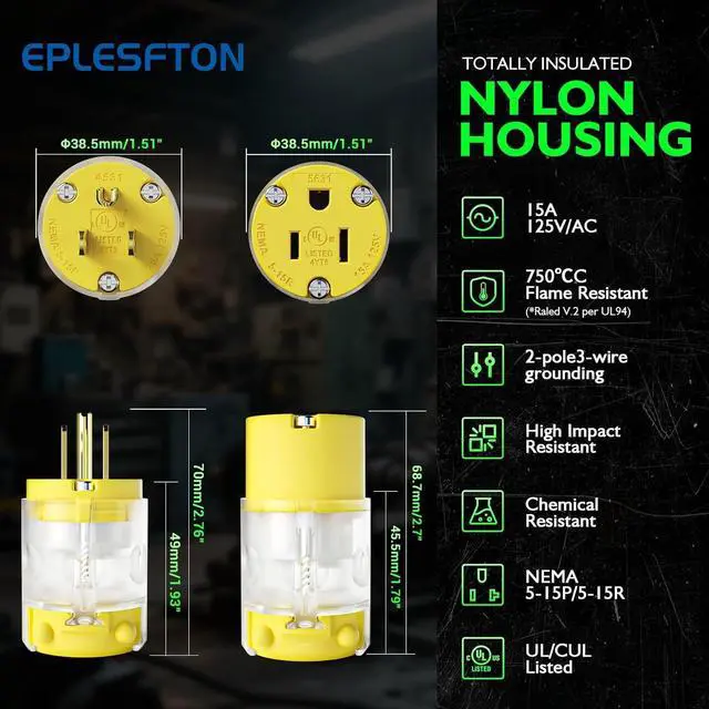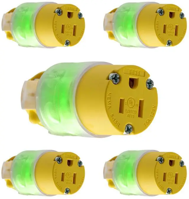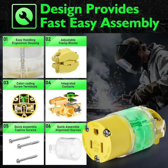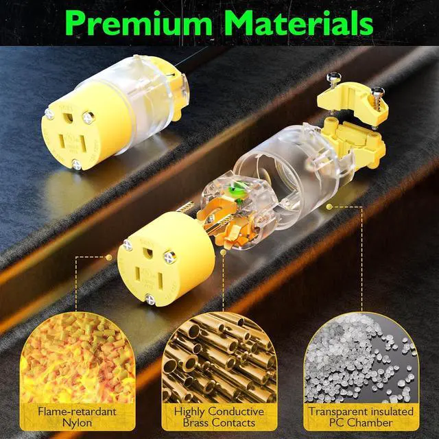 Lighted Power Indicator & Secure Connection: With a replacement plug 3 prong design featuring internal green neon light, this extension cord plug replacement clearly indicates power flow while in use.Crafted from heat-resistant Nylon (PA) body, transparent PC terminal covers, and solid brass terminals, this 15A plug and connector delivers superior conductivity, reduced overheating, and withstands 50,000+ plug/unplug cycles.