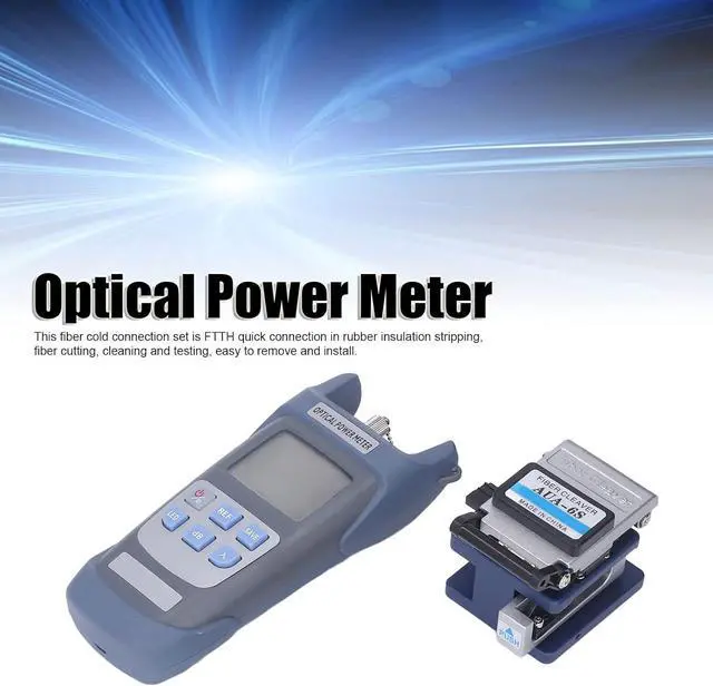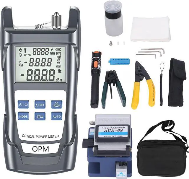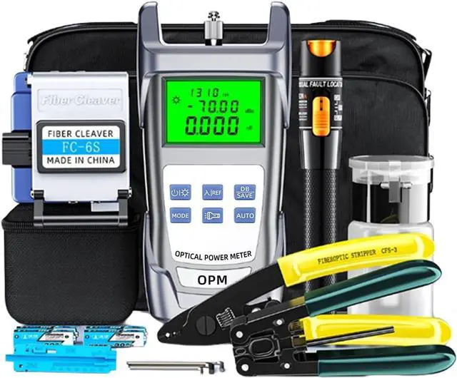 FTTH Equipment Accessories: This 11 in 1 assembly FTTH tool kit includes optical power meter, visual fault locator, fiber optic cutter, fiber optic stripping pliers, black handbag, fixed length track, clamp, etc