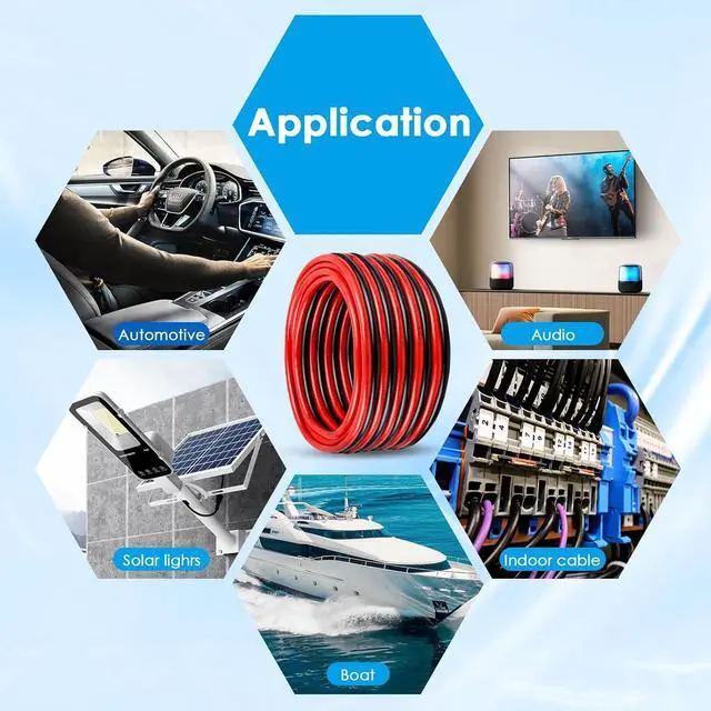 [Application]: Standard 2 conductor electrical wire that used in LED lights, speaker, automotive, home and solar panels, and can also be used in extreme environments such as rivers, lakes, solar applications and marine.