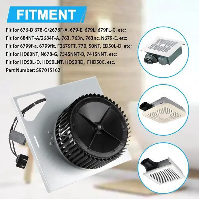 Fitment: S97015162 motor assembly replacement fits for Bro an Nu Tone bathroom exhaust fan: 676-D 678-G/2678F-A, 679-E, 679L, 679FL-C, 683-C, 685, 684-D, 684NT-A/2684F-A, 763, 763n, 763nc, 576, N679-E, N679FL-C, FL2679F, 6799f-a, 6799flt, F2679FT, 770, 50NT, ED50L-D, 784, 681NT, HD80NT, N678-G, 754SNNT-B, 741SNNT, HD50L-D, HD50LNT, HD50RD, FHD50C, DX70L, HD80L-D