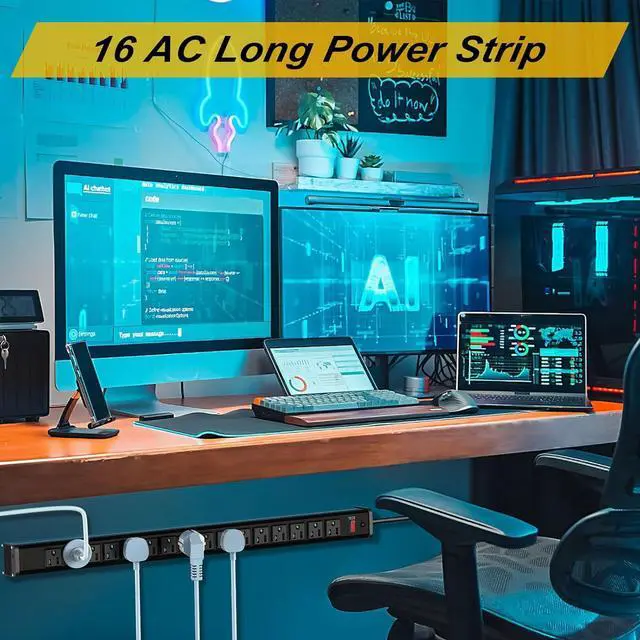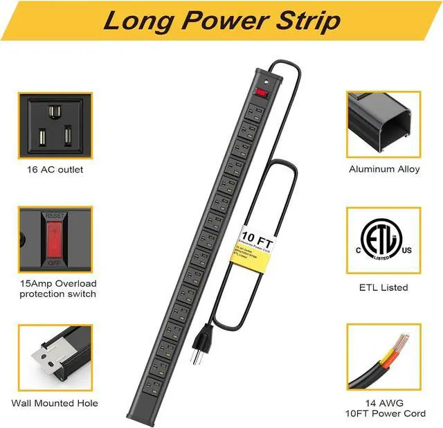 16-Outlet Long Power Strip: Power strip bulit in 16 AC outlets, multiple outlet design allows to directly plug in all commercial, home and office devices.
