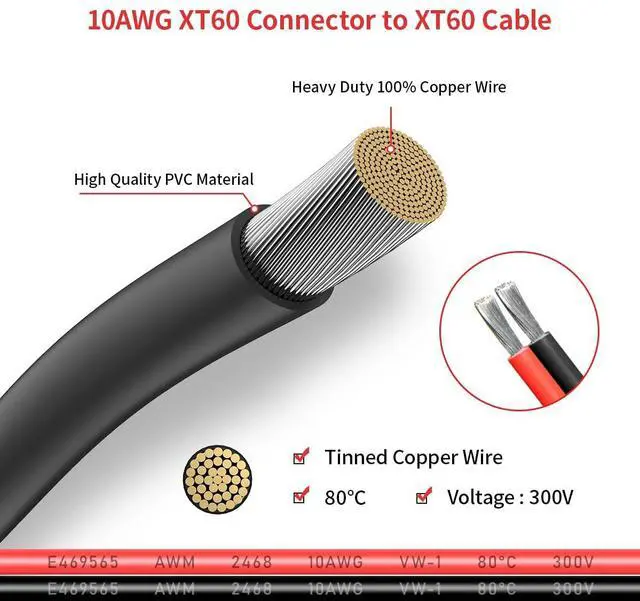 [You Will Get] 1*10AWG 10FT XT60 Extension Cable & 24 months friendly customer servic. Please contact us if you have any issue, we will reply and solve within 24 hours. (Note: Before Using Please Make Sure the Positive and Negative Poles are Correctly Matched)