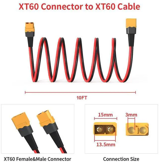 [Easy to Use] XT60 connectors fit most solar panels and battery packs,solar panels and power stations can be easily connected.Rated Voltage 300V. Cable Length: 10FT.