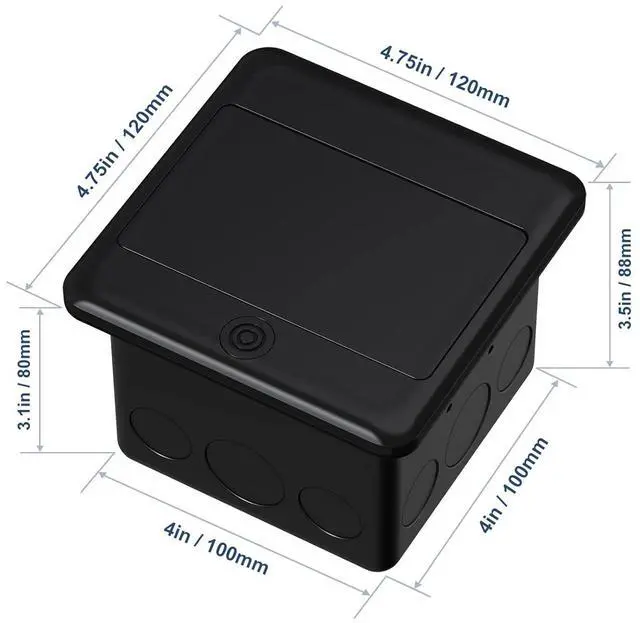 Floor Box Cover Gaskets Mounting Screws Junction Box Installation instructions 1-Year Technical Specifications: Outlet Power Rating: 20A, 125V Assembled: 4. 75" Length x 4. 75" Depth x 3.1 Height ABOUT US