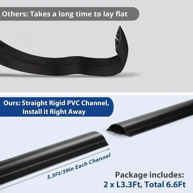 Rigid PVC Floor Cord Cover: 2x3.3ft, Total 6.6ft; thick (2.5 mm) and sturdy cable cover. A new type of cord floor cover for flat and hard floors; single piece 39in Raceway Lengths is sufficient for common floor cable management, you can also cut the floor wire cover to your needed length