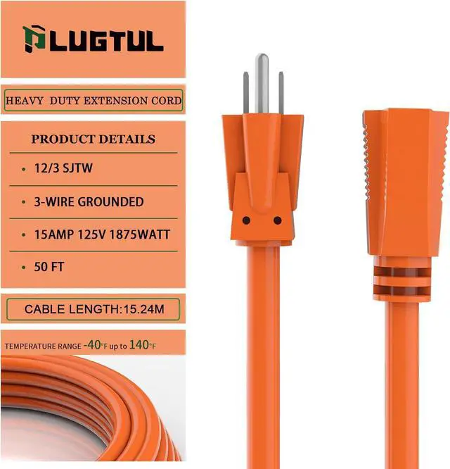 Specification 50 ft Heavy duty extension cord, 12 gauge with 3 pure copper wire conductors 125V, 15A, 1875W, male plug NEMA 5-15P to NEMA 5-15R, SJTW cord, ETL listed.