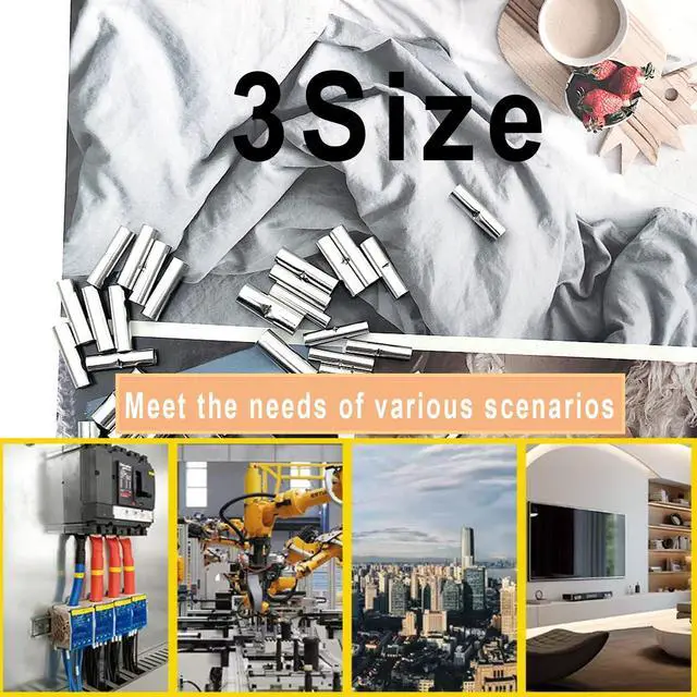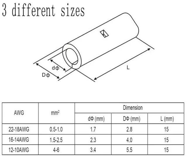 Size: Uninsulated butt connectors suits cable/ wire sizes : 10 -12 AWG / 14 -16 AWG / 18 - 22 AWG