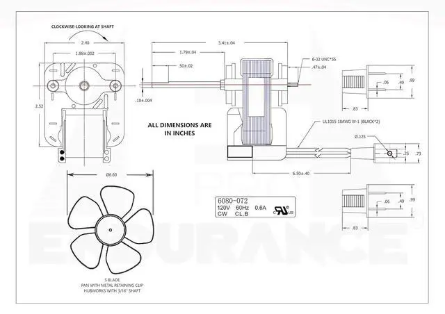 ITEM SPECIFICATIONS120 volts, 60 hz, 0.6 amps, cw (clockwise), cl.b, 3000 RPM