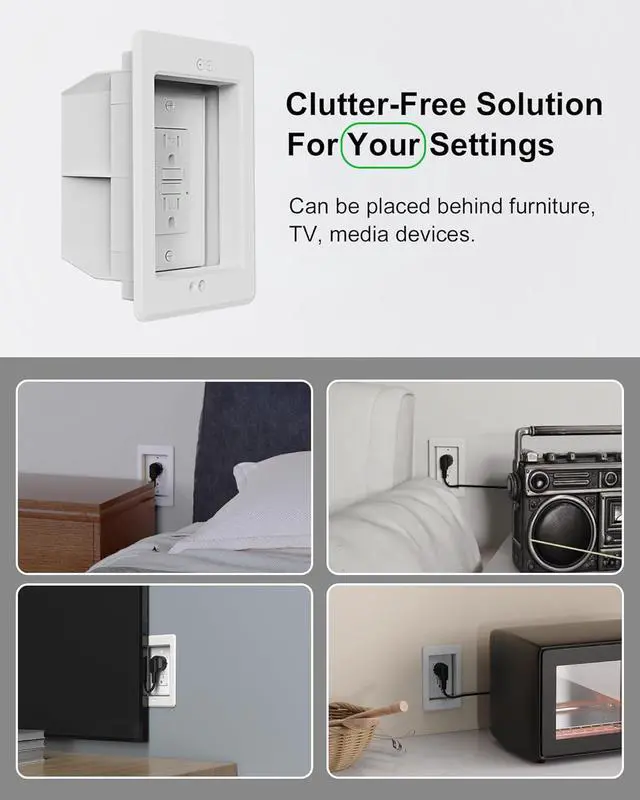 [Maximize Space Savings] The recessed design of this GFCI outlet box optimizes space, allowing for flexible installation behind televisions, media devices, tablets, appliances, and furniture. It provides a clutter-free solution suitable for various environments, making it ideal for living rooms, kitchens, bathrooms, laundry rooms, offices, garages, and outdoor terraces or porches with protective enclosures.