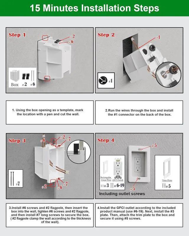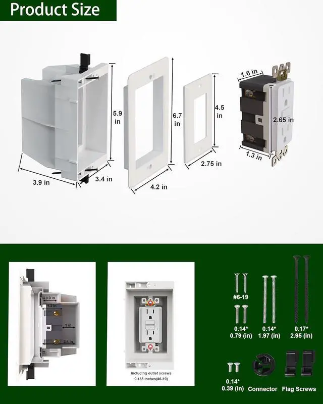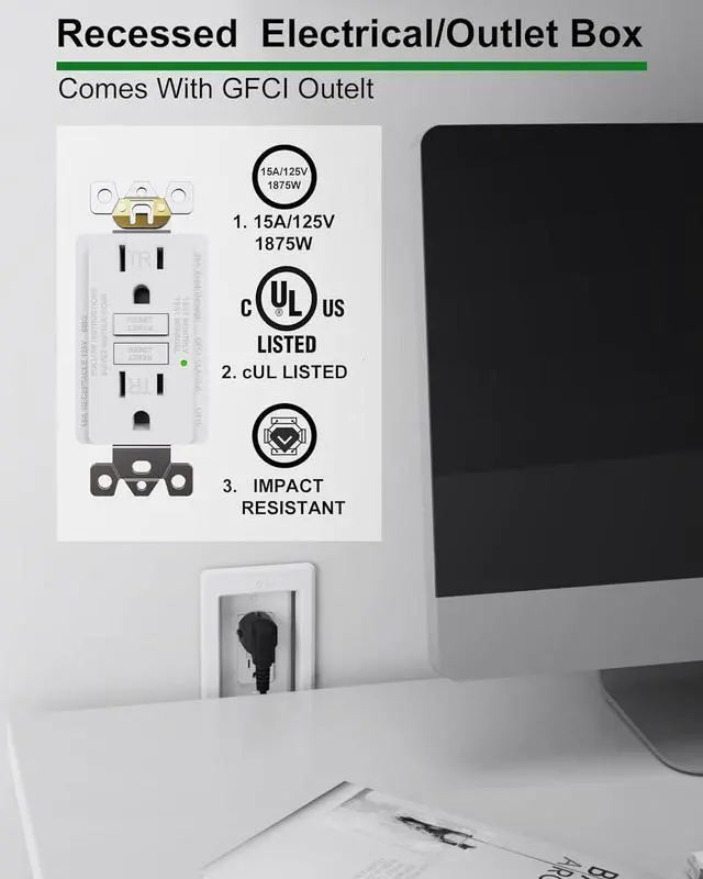 [15 Amp GFCI Outlet] Recessed Outlet Box include a 125V, 15 Amp, Tamper Resistant GFCI outlet that can detect ground faults and automatically cut off power to prevent severe electric shock. It meets or exceeds UL943 and UL498 standards for safety and reliability. The recessed electrical boxes ensure dependable performance while prioritizing safety. (Note: Excluding fixed outlet screws. Thread diameter required: 0.138 inches(#6-19) )