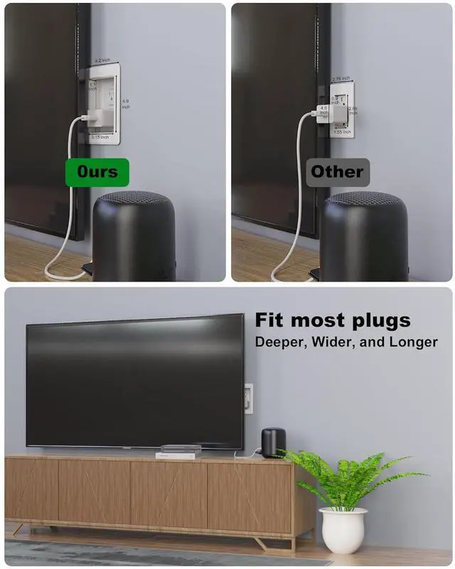 [Increased Storage Capacity] This in wall recessed outlet is larger than a standard recessed outlet, providing ample depth and width to accommodate the entry and power requirements of larger plugs.