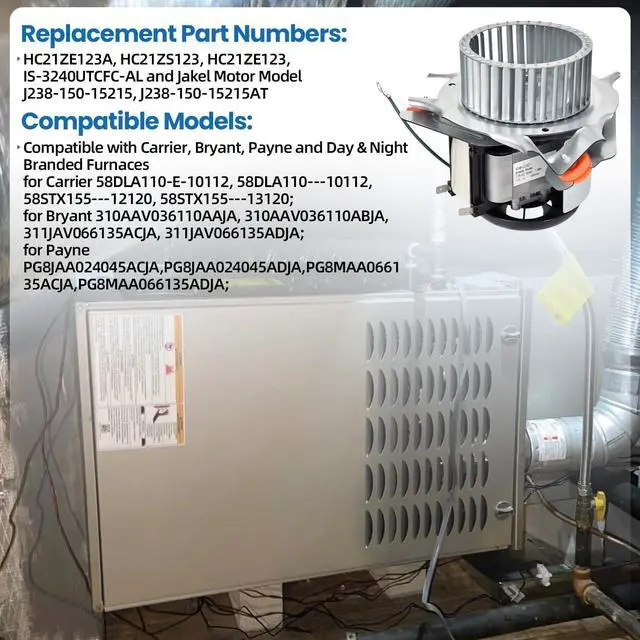 Compatible Furnaces Models: This furnace blower motor is specially designed to compatible with Carrier, Bryant, Payne and Day & Night Branded Furnaces. Carrier 58DLA110-E-10112, 58DLA110---10112, 58STX155---12120, 58STX155---13120; Bryant 310AAV036110AAJA, 310AAV036110ABJA, 311JAV066135ACJA, 311JAV066135ADJA; Payne PG8JAA024045ACJA, PG8JAA024045ADJA, PG8MAA066135ACJA, PG8MAA066135ADJA and More