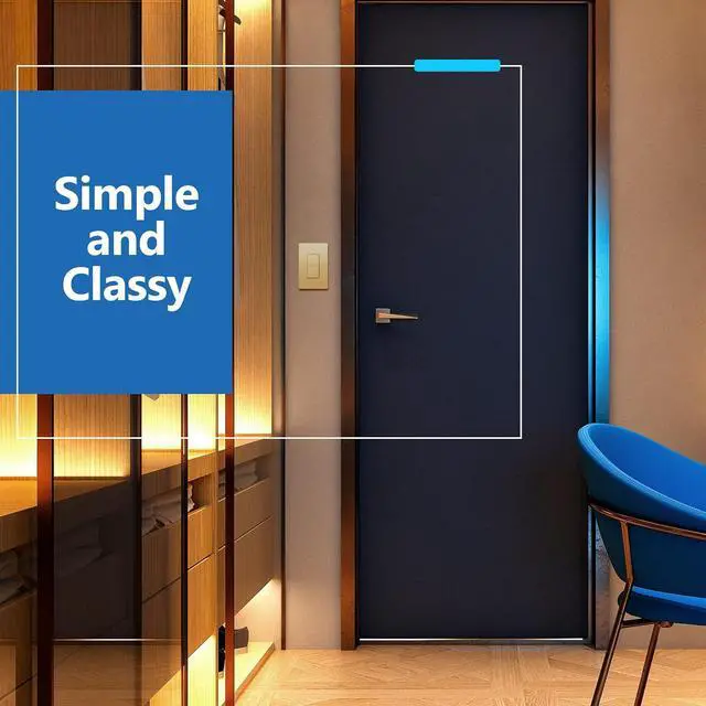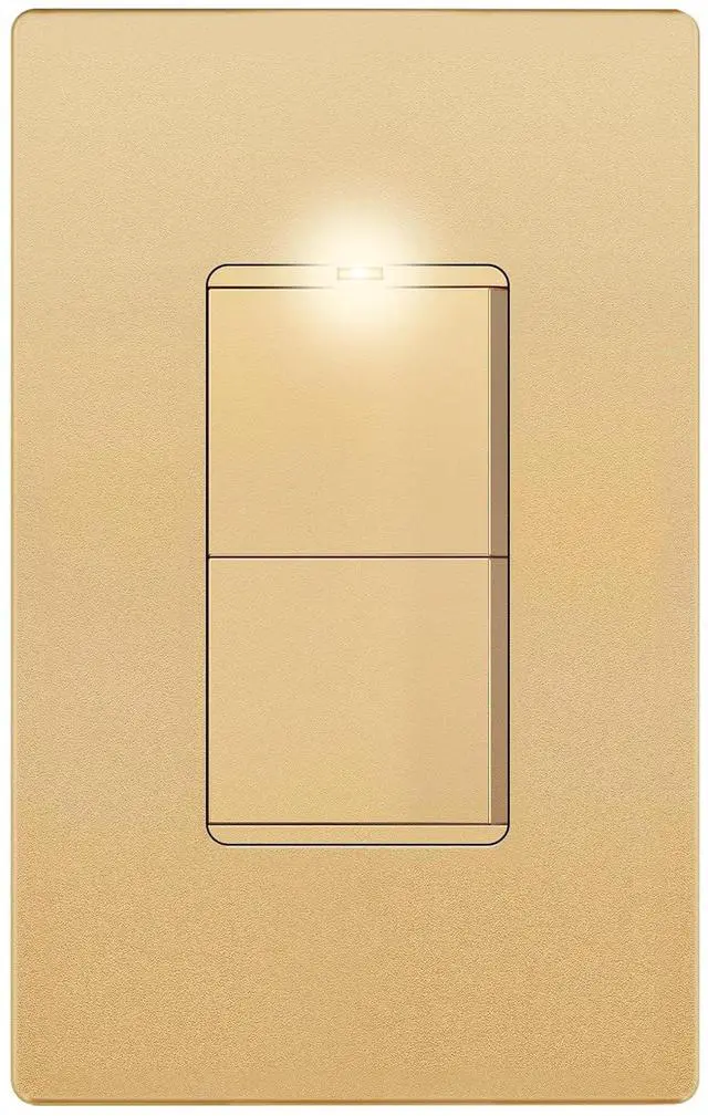 Gold color; device dimensions: 1.42 weight x 2.77 height x 1.40 depth; 15A, 120-277VAC, single pole; break-off plaster ears; ground terminal; wiring instructions included; wall plate sold separately; 1-year warranty; UL Listed