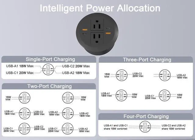 Desktop Plug Station Rating - 110-125V,12A,1500W,60HZ,USB-A:5V/3A,9V/2A,12V/1.5A Max 18W,USB-C:5V/3A,9V/2.22A,12V/1.67A,Max 20W