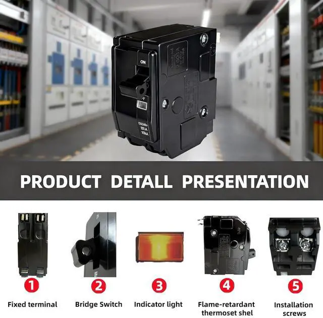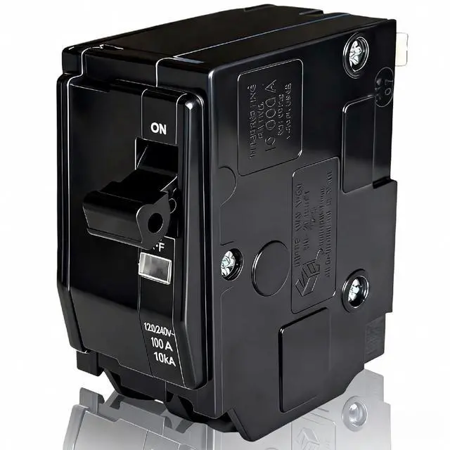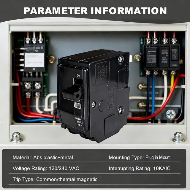 Product SpecificationsThis circuit breaker is a plug-in miniature circuit breaker with a rated voltage of 120/240 V, a breaking capacity of 10 kAIC, a frequency of 50/60 Hz, and a terminal tightening torque of 36 lb·in (4 N·m).