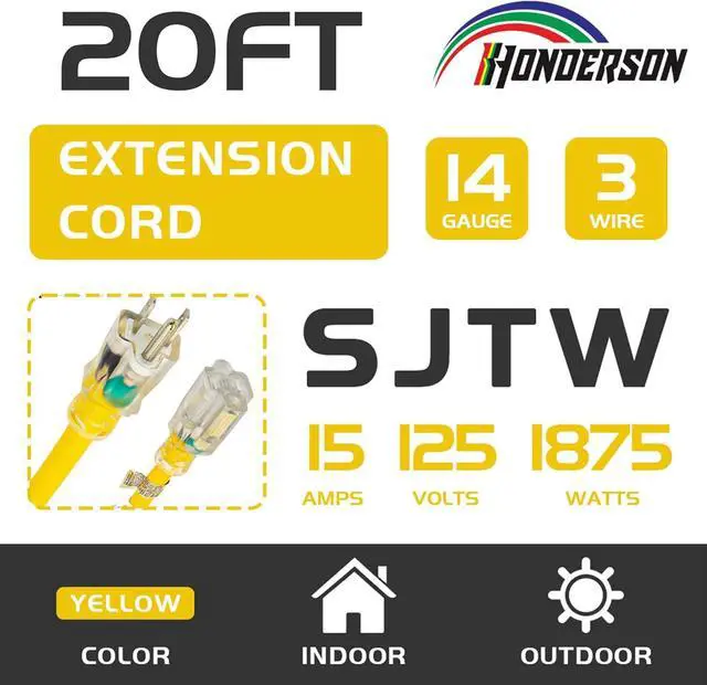 PERFORMANCE PARAMETER: Yellow 20FT extension cord with Lighted End, 14gauge, 3 prong grounded plug, 15amp, 125volt, 1875watt. Temperature Range: -40°F to +140°F.