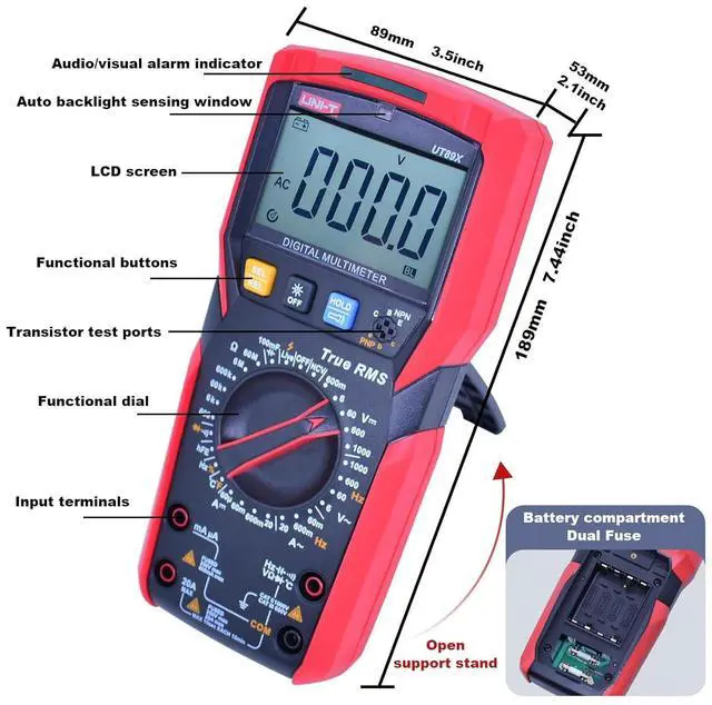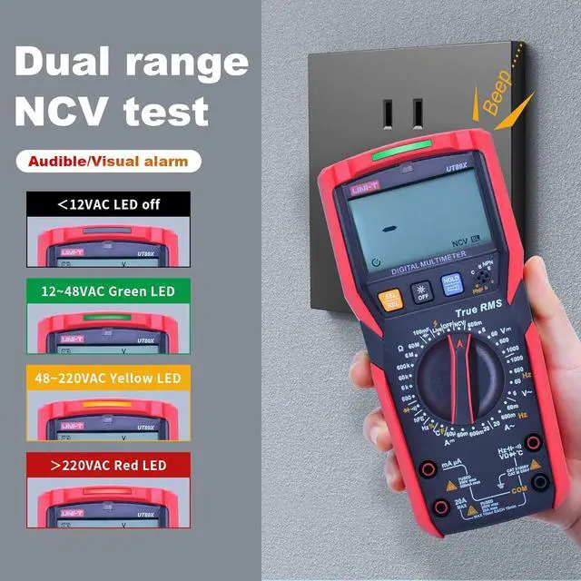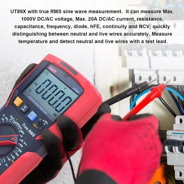 TRMS 6000 Counts hand-held 35/6 bit Digital Multimeter Measures up to 1000V AC/DC voltage, 20A AC/DC current and 60M resistance.It can measure Max. 1000V DC/AC voltage, Max. 20A DC/AC current, resistance, capacitance, frequency, Temp,Live wire,diode, hFE, continuity and NCV, quickly distinguishing between neutral and live wires accurately.