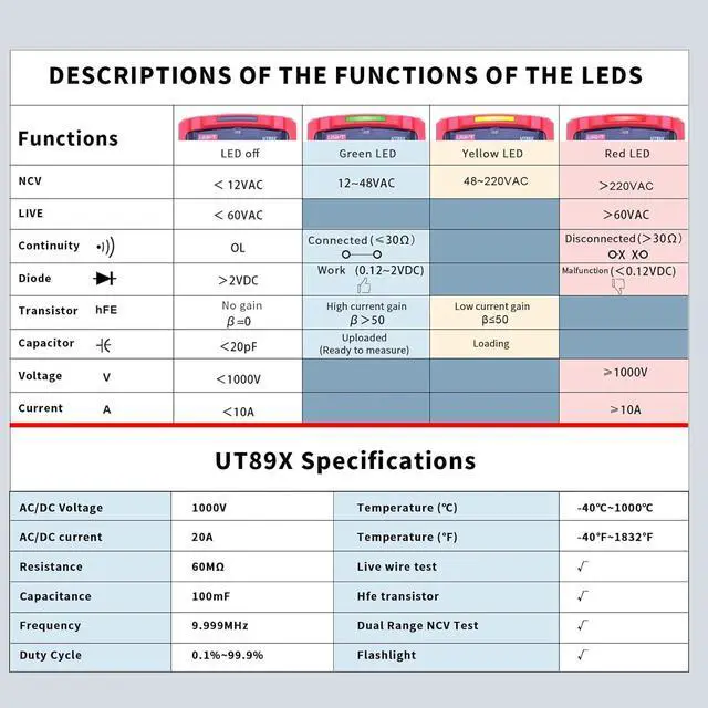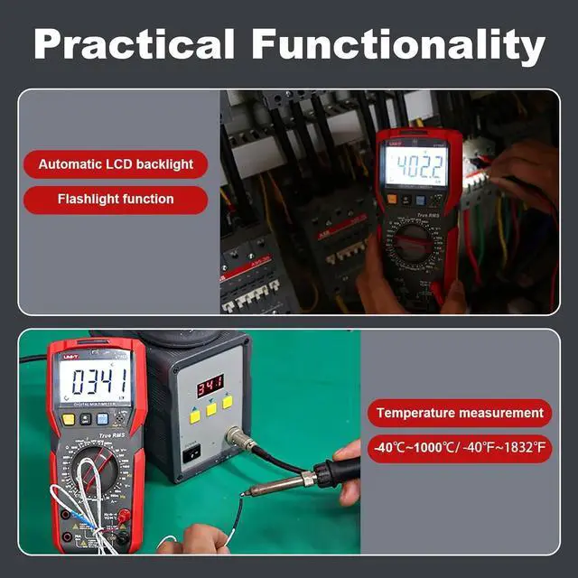 Features Equipped with audible and visible alarm,flashlight,data hold,auto shut-off,auto backlight functions and low battery indicator,this series can be used in dark environment.