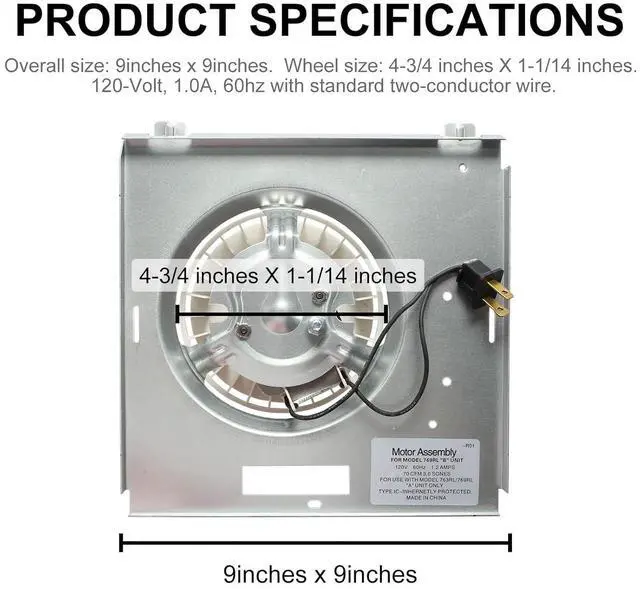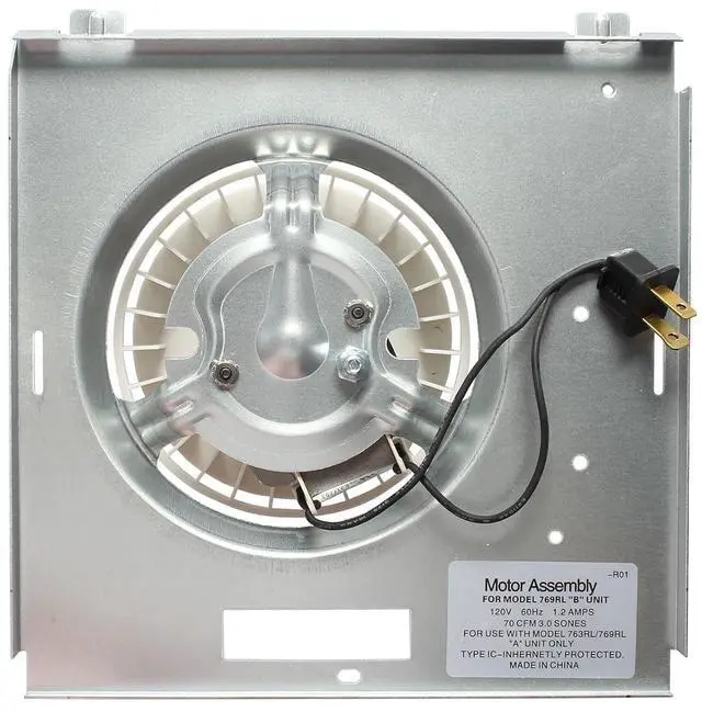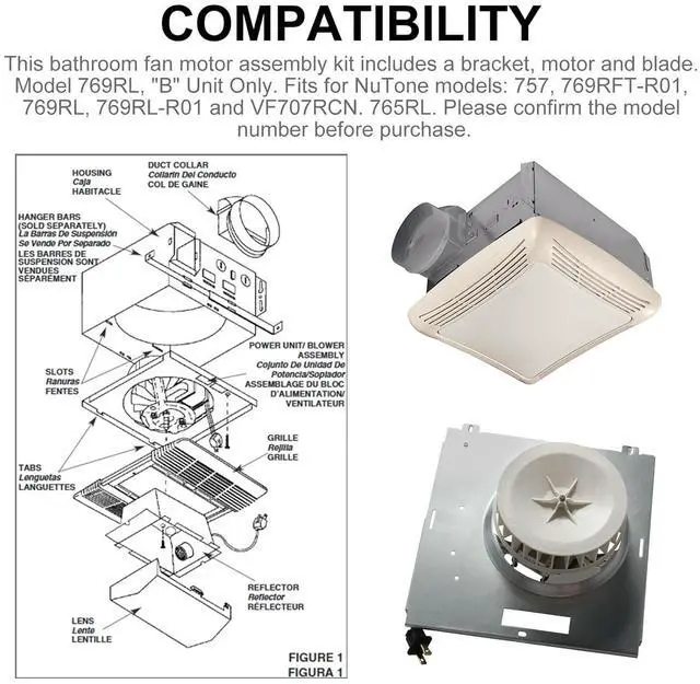Usage Bathroom fan replaces motor components, "b" unit only. Fits Nutone models: 757,769 RFT-R01,769 RL, 769 RL-R01 and VF 707 RCN.765 RL.