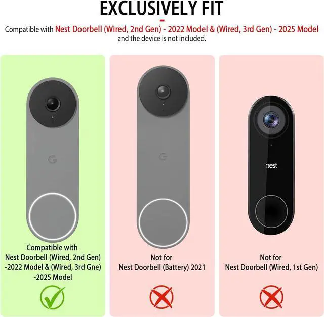 NEST DOORBELL SILICONE CASE: Specially designed for Google Nest Hello Ring Doorbell (Wired, 2nd Gen) - 2022 model & (Wired, 3rd Gen) - 2025 model, it allows full functionality without obstruction - the case does not block the camera, microphone, speaker or night vision.Please note: Not compatible with Nest Hello Door Bell (Battery) 2021 and Nest Doorbell (Wired, 1st Gen), the device is not included.Please ensure the doorbell model is correct before purchasing.