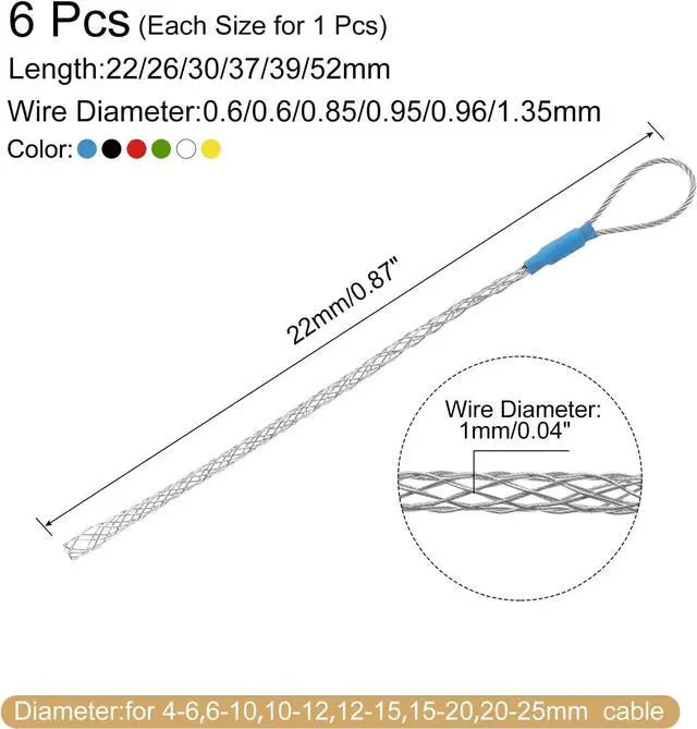 The wire puller socks ,is in size of:Length:22/26/30/37/39/52cm ;Wire diameter:Blue,Black,Red,Green,White,Yellow0.6/0.6/0.85/0.95/0.96/1.35mm/;Diameter:for 4-66-1010-1212-1515-2020-25mm cable;Color:Blue,Black,Red,Green,White,Yellow;Material: galvanized steel;In the package of: 6 x Single Wire Mesh Puller Socks Grip;