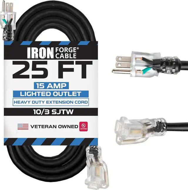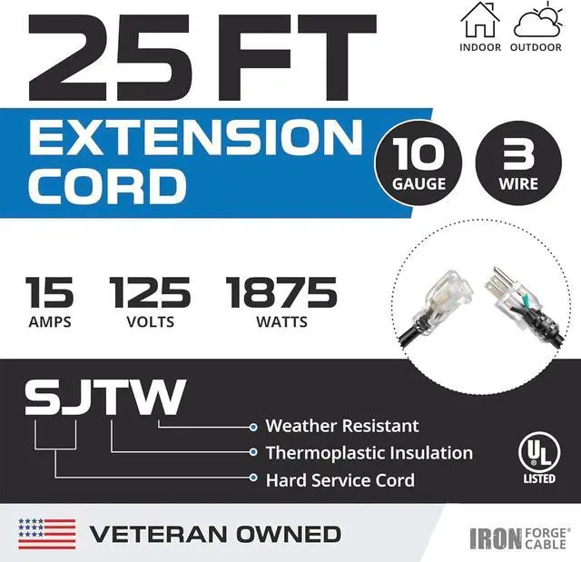 UL CERTIFIED: 10 gauge/10 awg, 3-wire grounded plug, ultra heavy duty black electric cable, 25 foot, 15 amp extension cord, 125 volt, 1875 watt, 5-15P/R. Lighted End to indicate power.