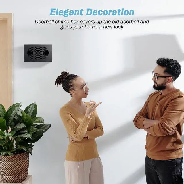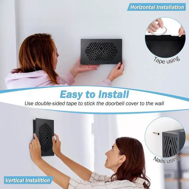 Easy to InstallThis door bell covers for inside is very easy to use; You can hang it on the wall directly without drilling or using screws; You can also use our complimentary double sided tape to stick the door bell chime box cover to the wall; Installation is very simple and safe and requires no tools or special skills