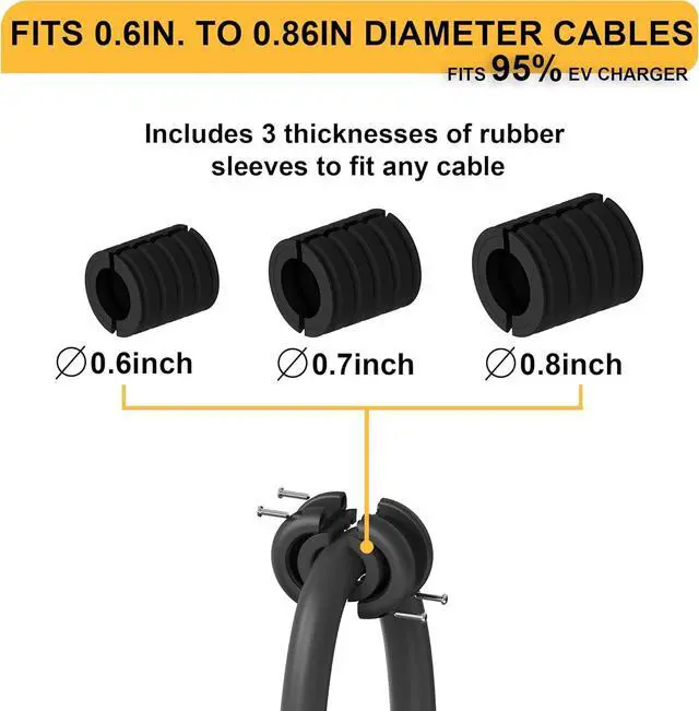 Fits 0.60 in. to 0.86 in. diameter Cables (95% of EV Plugs)Universally compatible with thick charging cables, including Type 1 (J1772), Type 2 (Mennekes), and Tesla connectors.