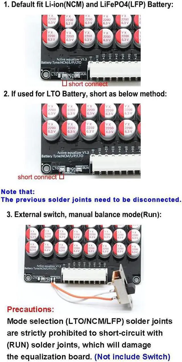 Working Principle: Flying capacitor transfer charge transporter, Balancer board is connected to the battery to start the balance work, using the original brand new ultra-low internal resistance MOS, 2OZ copper thickness PCB. balance current 0-5.5A, the more balanced the battery current is Small, reserved for the dormant switch wiring position, the dormant power-off mode working current is less than 0.1mA, and the balance voltage accuracy is within 5mv!