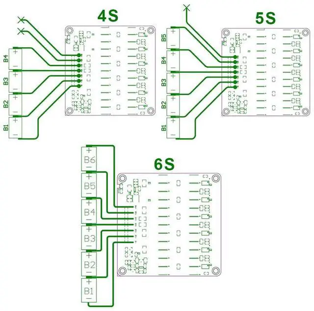 NOTE: Before connect the balance cable to the balance board, be sure to check whether the connections of each section of the battery pack are correct, and do a good job of insulating the bottom of the board and the battery string connection terminals. Otherwise, it will short-circuit and burn the board. Tips: This balancer board is backward compatible by default. eg. If it is used for 5S, the last line B6+ is empty.