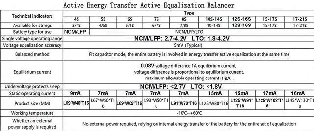 With under-voltage sleep protection, only detecting the B1 battery voltage, the equalizer will automatically stop entering the sleep state when the B1 voltage NCM/LFP<2.7V or LTO<1.8V, and the standby power consumption is less than 0.1mA. Board size: 2.71x2.71x0.63inch, Balance cable length: 15.7inch.