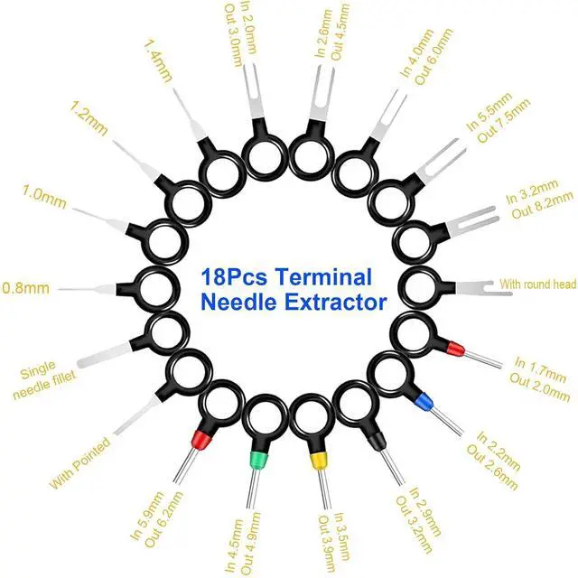 Terminal Removal Tool Kit18pcs electrical pin removal tool kit includes 6pcs single pin extractor, 6pcs double pin extractor and 6pcs casing tool. Our terminal release tool set is made of high-quality stainless steel. The terminal extractor tool is easy to use, just push and pull the terminal pins with connector removal tool for removal effortlessly from the wire harness connectors without any damage.