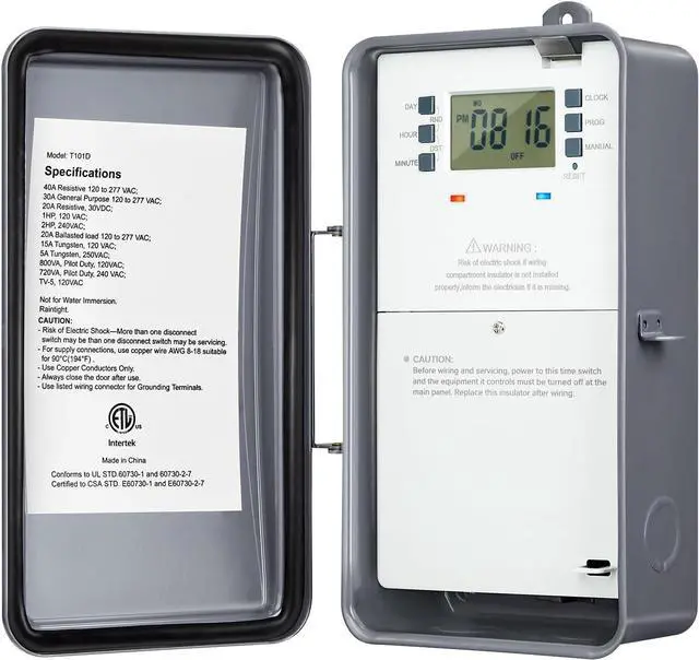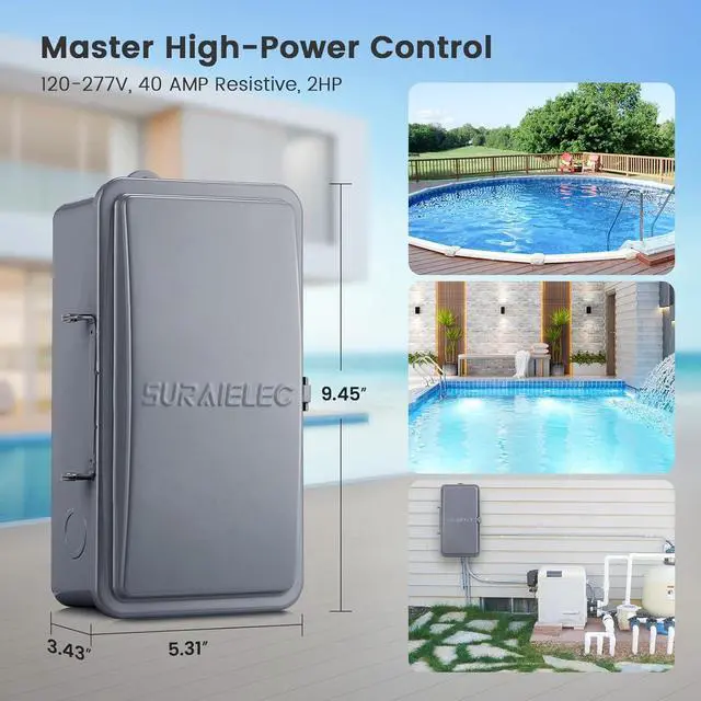 Heavy Duty 40 AMP Digital Pool Timer 120 to 277 VAC, 40A Resistive, 1HP to 2HP capacity allows the outdoor timer box to be used to control high-power electric devices like pool filter pumps, fountains, water heaters, spas, Christmas holiday lights, patio/landscape lighting...; ETL Listed and conforms to UL STD.60730-1