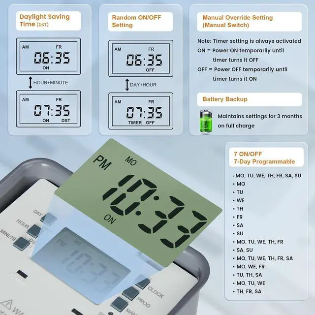 Versatile Timer Function Digital pool timer wall switch has 7 ON/OFF program settings, 15 day combinations, single-day 24 hour settings, Daylight Saving Time (DST), and Random function; this 7-day repeat cycle timer with rich programming choices satisfies customers' most of needs easily
