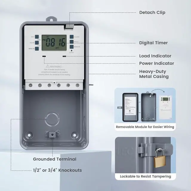Weatherproof Heavy Duty Metal Casing Raintight and rust-proof construction; This 40 amp timer switch is made of sturdy metal casing and durable insulating and flame retardant material that resists abrasion, moisture, and direct sunlight; Lockable metal box cover protect the smart pool timer against rain, snow, and dust and resist tampering
