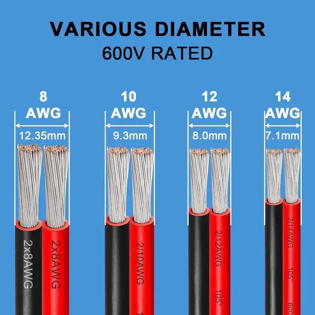Voltage Rating: 600 Volts; Rated temperature: -40 - + 105 ;12 AWG silicone wire - super flexible 65 strands of 0.254 mm Tinned copper wire - Highly efficient - Super low impedance for a highly efficient connection.